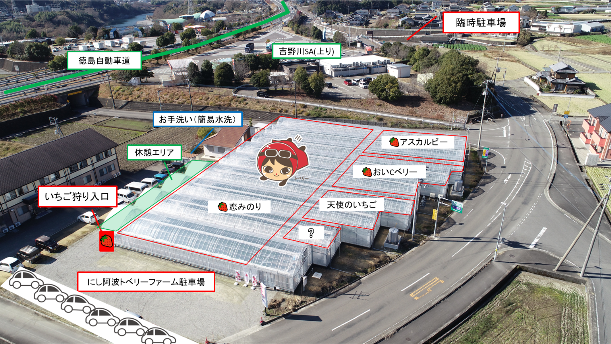 農園前駐車場と臨時駐車場をご案内しています。吉野川ハイウェイオアシス近くです。👇写真クリックで全体確認できます。