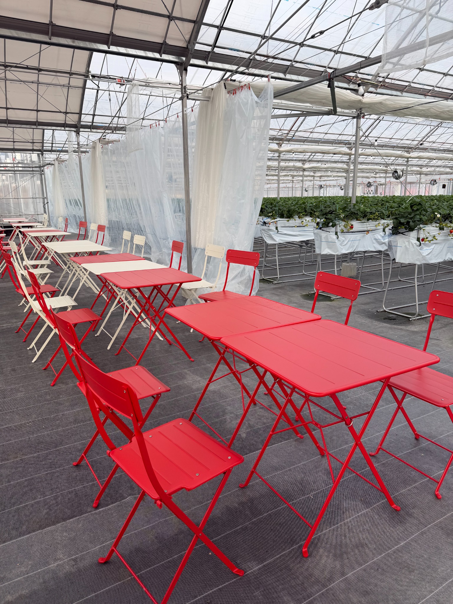 指定のテーブルでお楽しみいただけます。イチゴ栽培レーンのエリアへの持ち込みはご遠慮ください。