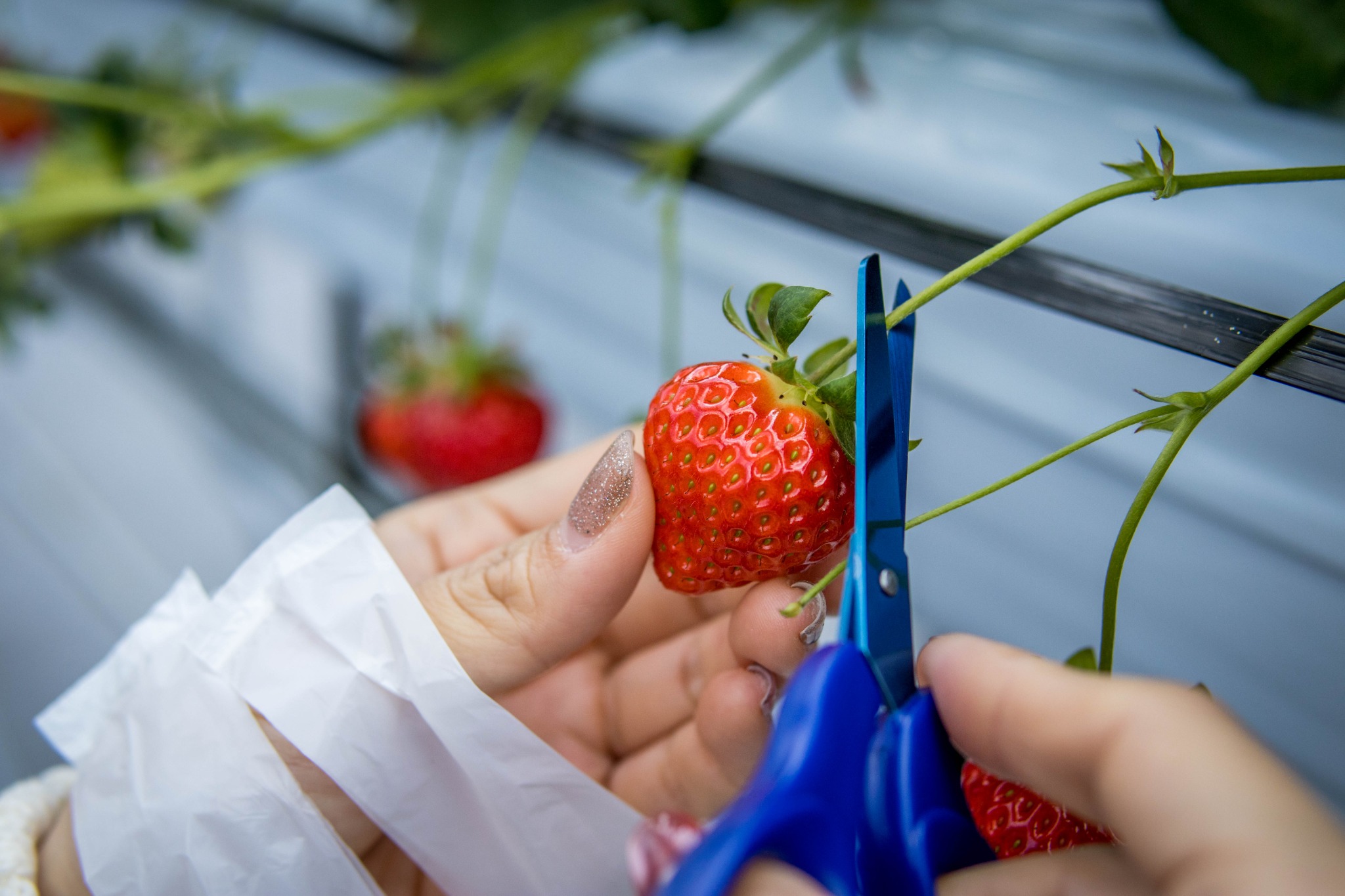 イチゴのツルをハサミで切ってイチゴを取ります。
